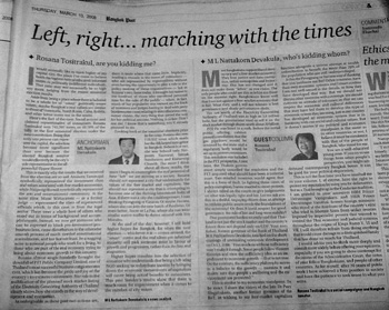 ข้อเขียนจากคอลัมน์ Anchorman โดย ม.ล.ณัฐกรณ์ เทวกุล หน้า 11 หนังสือพิมพ์ บางกอกโพสต์ ฉบับวันที่ 13 มีนาคม 2551 เรื่อง Rosana Tositrakul , are you kidding me ?