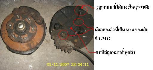 ซื้อมาใส่เลยไมได้นะครับต้องจัดการกับขาที่ใส่ลูกหมากคันชักคันส่งก่อนนะครับ ที่ซื้อมาใช้มันเป็นของรถตู้เป็นลูกหมากแร็กรูมันจะใหญ่กว่าลูกหมากแบบกระปุก เราต้องถอดขาลูกหมากของดุมล้ออันเก่าออกมาใช้ครับและต้องเอามาเจาะขยายรูที่ยึดขาใส่ลูกหมากกับดุม 2 รูให้โตขึ้นจาก M12เป็นM14(จาก12มม.เป็น14มม.ซื้อดอกสว่านมา 200 บาทครับ) เท่านี้ก็ใช้ได้แล้วครับได้เบรคที่มีประสิทธิภาพดีขึ้นแล้วครับ