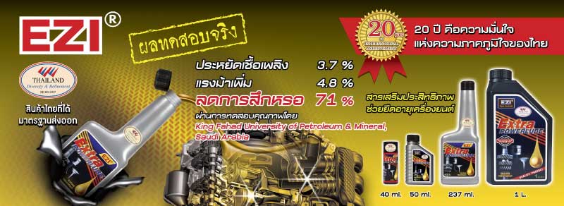 ผลิตภัณฑ์ในลักษณะนี้ก็ Comment กันได้ต่าง ๆ นา ๆ แต่ EZI extra Power Lube ยืนยันด้วยผลทดสอบจากสถาบันที่น่าเชื่อถือ ได้รับรับเครื่องหมายมาตรฐานการส่งออก (ยี่ห้อเดียวในผลิตภัณฑ์ประเภทเดียวกัน) ผลิตและพัฒนาโดยคนไทยที่ได้รับการถ่ายทอดเทคโนโลยีจากประเทศเยอรมัน และแคนนาดา เวลาเป็นเครื่องพิสูจน์ ผลิต และจำหน่ายมา 20 ปี รายละเอียดเพิ่มเติมได้ที่ http://www.ezipowerlube.com>