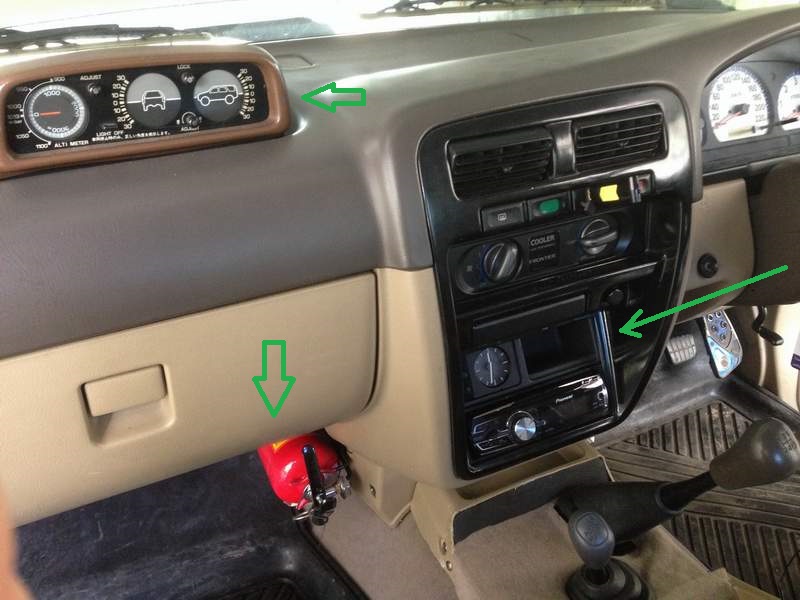-ต่อมาก็เปลี่ยนเอาเกจ์ 3 ช่องออก ใส่นาฬิกาเข็ม+ช่อง เป็นอะไหล่รถ BMW E36 / ใส่แลนด์มิเตอร์ของโตโยต้าLN130ซึ่งมีสีน้ำตาล และทำมาเพื่อตั้งบนพื้นเอียง แลนด์มิเตอร์นิสสันเจอแต่สีเทา,แดงเข้ม มีฐานเรียบคือต้องตั้งบนที่ราบเรียบ... และใส่ถังดับเพลิงขนาดเล็กด้วยครับ.....