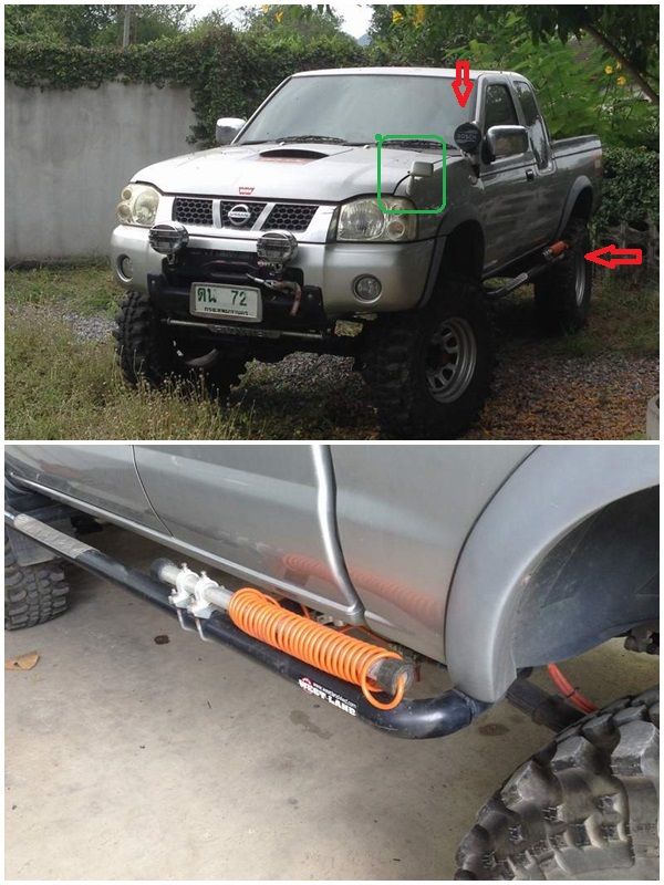 -สปอตไล้ท์หน้า 2 ดวง + side lamp 1ดวง ....ศรสีแดงชี้สายจ่ายลมแบบขดสปริง...กรอบสีเขียวคือกระจกมองมุมเป็นอะไหล่จากเทอราโน่ ทู(ต่างกับของเทอราโน่ วัน ที่ฐาน)