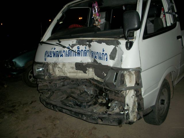 เมื่อคืนผมได้ขับรถไปส่งภรรยาไปทำงาน เอาลูกไปด้วย(ลูกหลับอยู่เบาะ 2 นอนยาวอยู่) ระหว่างรอไฟแดงที่แยกห้าเชียง(ลำปาง) ปรากฏว่า มีรถตู้เบรกแตกมาชนท้ายอย่างแรง ภรรยาผมตกใจมากบอกให้รีบเอาลูกลงรถก่อน หลังจากเอาลูกลงรถไปแล้ว จึงไปตรวจสอบรถ เห็นรถแล้วใจหาย กันชนปาเหลี่ยมที่ว่าแข็งๆพัง ประตูบานท้ายยุบกระจกแตก ส่วนรถตู้ช่วงหน้าพัง หม้อน้ำแตก สภาพตามรูป คนขับรถตู้บอกจะรับผิดชอบค่าซ่อมให้ จึงขอความช่วยเหลือจากพี่ๆหน่อยครับ เพราะปาเหลี่ยมอะไหล่ตามท้องตลาดไม่มี โดยเบื้องต้นคิดว่าน่าจะมีรายการดังนีั้้