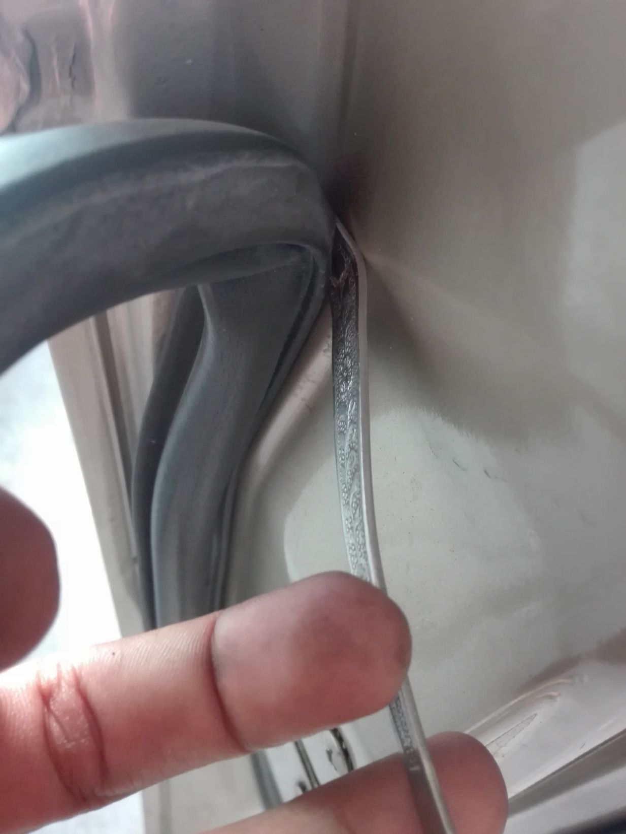 เมื่อถอดยางมาเรื่อยๆจะยังเอายางออกไม่ได้ครับ มันจะติดตัวสลักกันเลยประตู ต้องตอดสลักออกแล้วก็นำยางออกมาได้ครับ