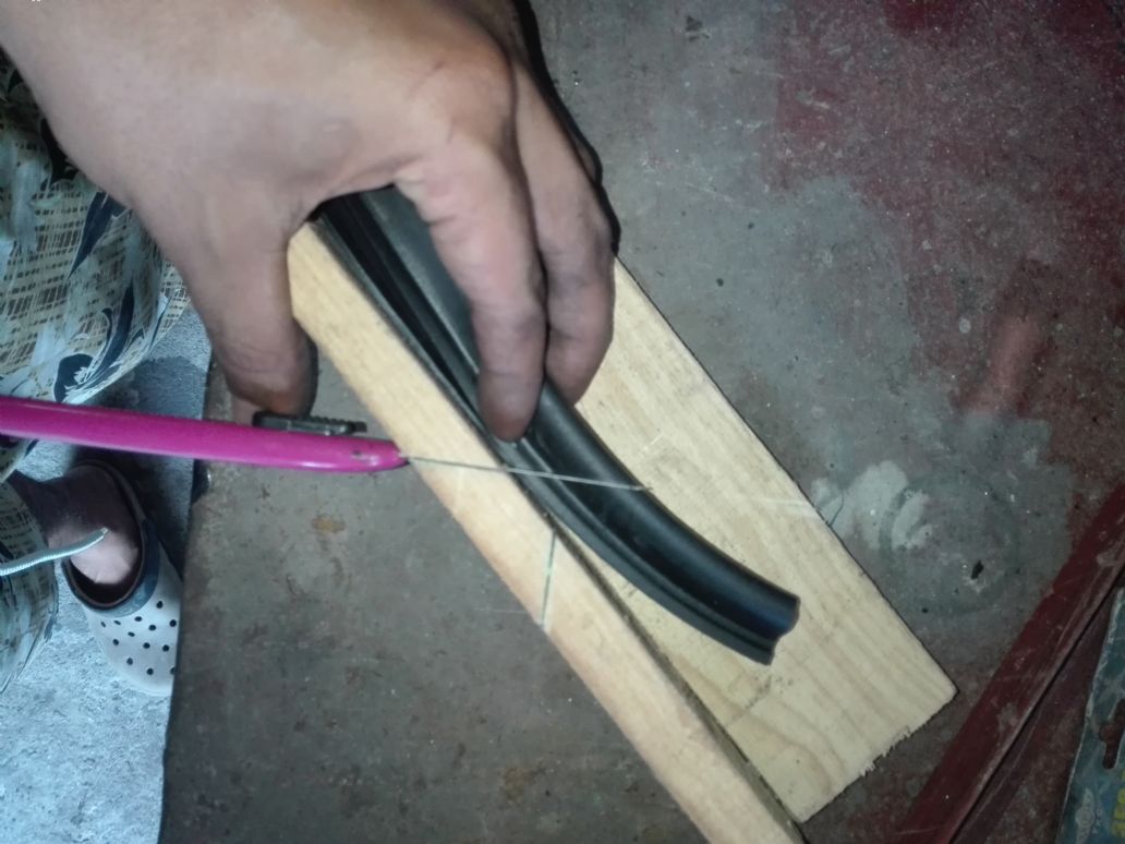มาเริ่มdiy กันเลยครับ เริ่มจากนำยางทีได้มา ตัดเข้ามุม45 โดยผมสร้างอุปกรณ์พิเศษอีกแล้วครับเพื่อให้มุมยางได้45องศาพอดีครับ