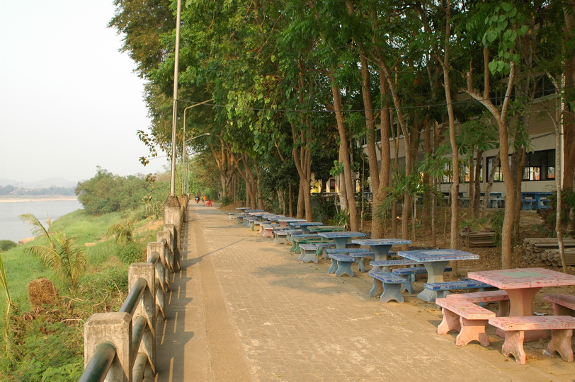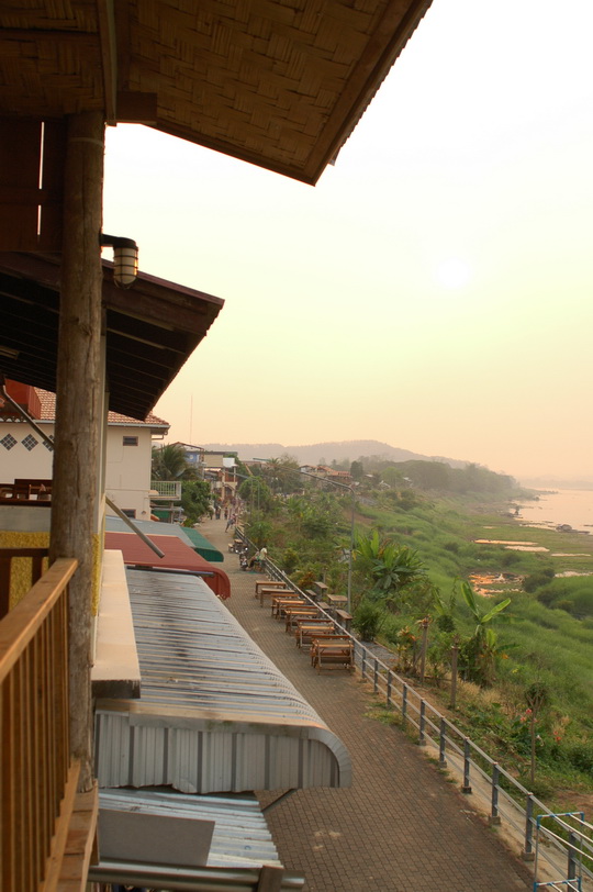 ชั้นสองติดริมโขงดูวิวยามเย็นแต่อากาศร้อนมากจนกว่าพระอาทิตย์ตกอากาศค่อยเย็นลงเดินเล่นตลาดคนเดิน