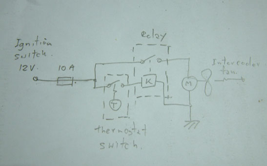 สายเทอร์โมสตัทมีสองเส้น เข้าไฟที่มาจากสวิทซ์กุญแจเส้นหนึ่งอีกเส้นเข้าขดรีเลย์ จากขดรีเลย์ที่มาจากเทอร์โมสตัทเอาอีกขาลงตัวถัง