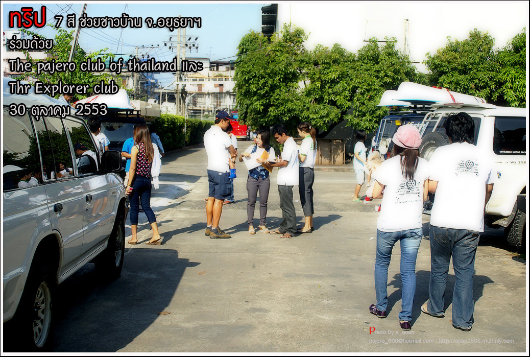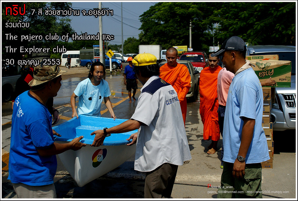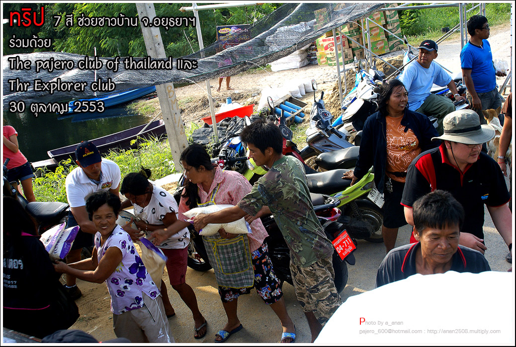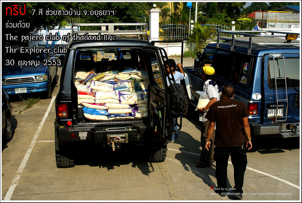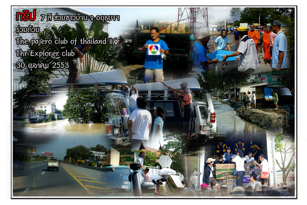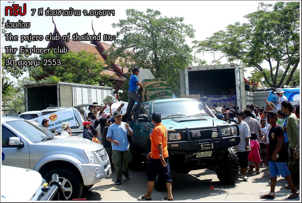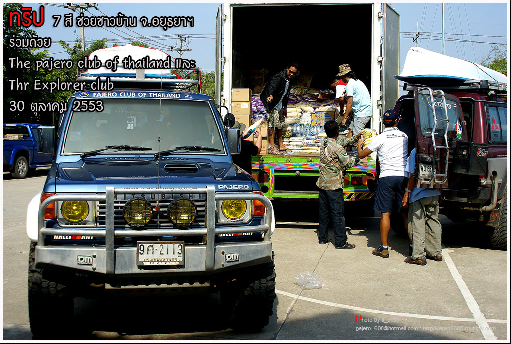 เป็นความร่วมมือของภาคหน่วยงาน ทั้งราชการ เอกชน องค์กรต่างๆ และทางกลุ่ม The pajero club of thailand และThe Explorer club ได้มีโอกาสเดินทางร่วมขบวน เพื่อเข้าช่วยเหลือ แจกจ่ายถุงยังชีพ แก่พี่น้อง ชาวจังหวัด พระนครศรีอยุธยา ด้วยขบวนรถของทางช่องเจ็ด ที่มีสัมภาระจำเป็นแก่ผู้ประสบภัย จำนวน สองคันรถบรรทุก กับขบวนออฟโรด อีกจำนวน 14 คัน เพื่อให้สามารถเข้าถึงพื้นที่ให้ได้มากที่สุด