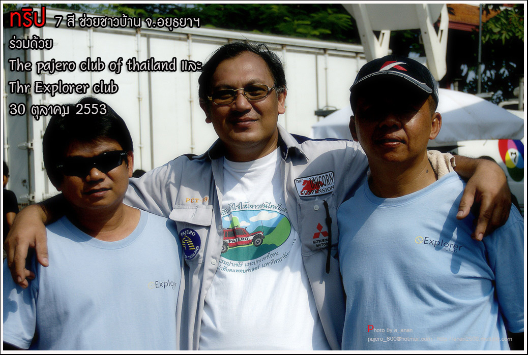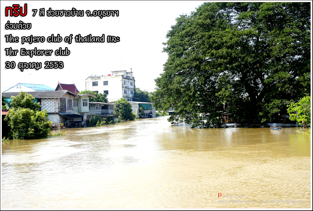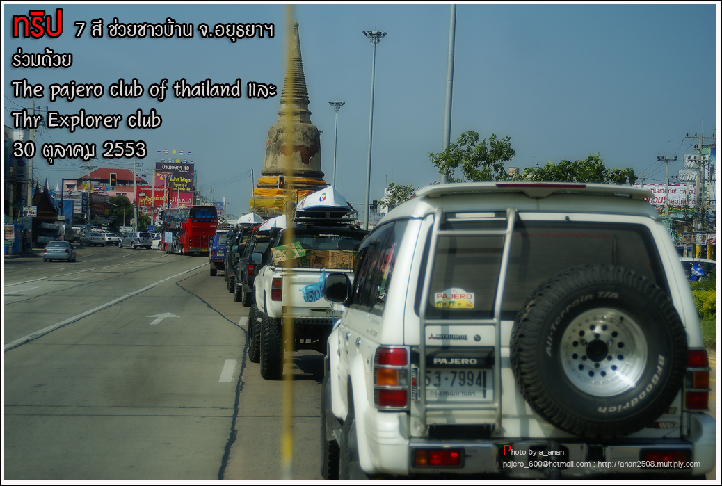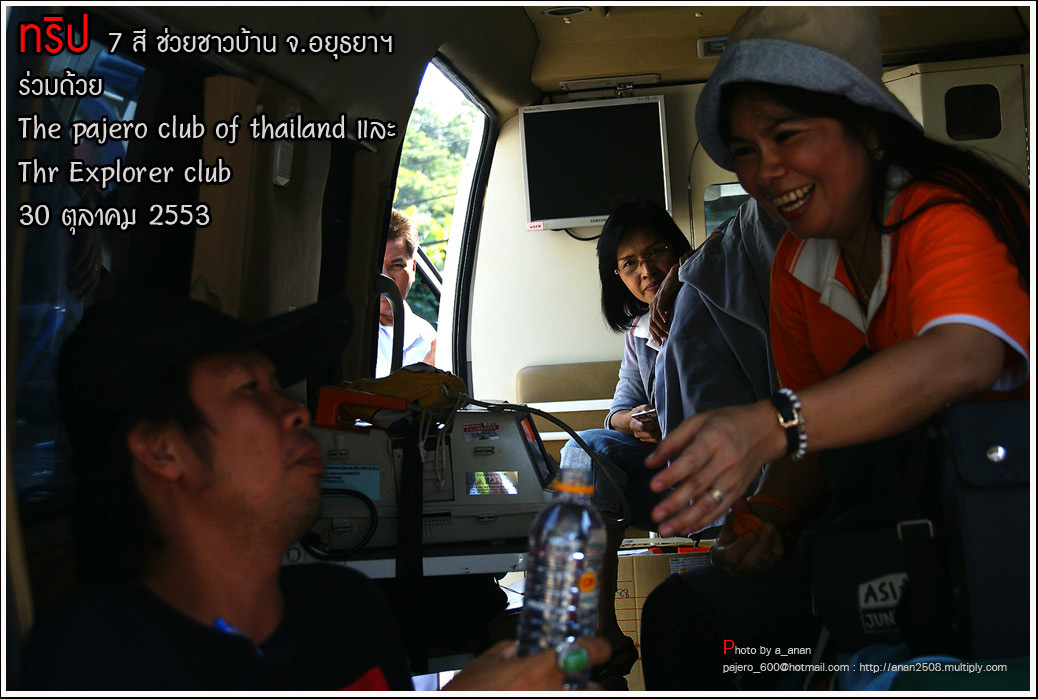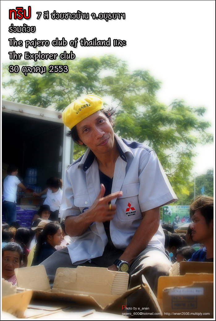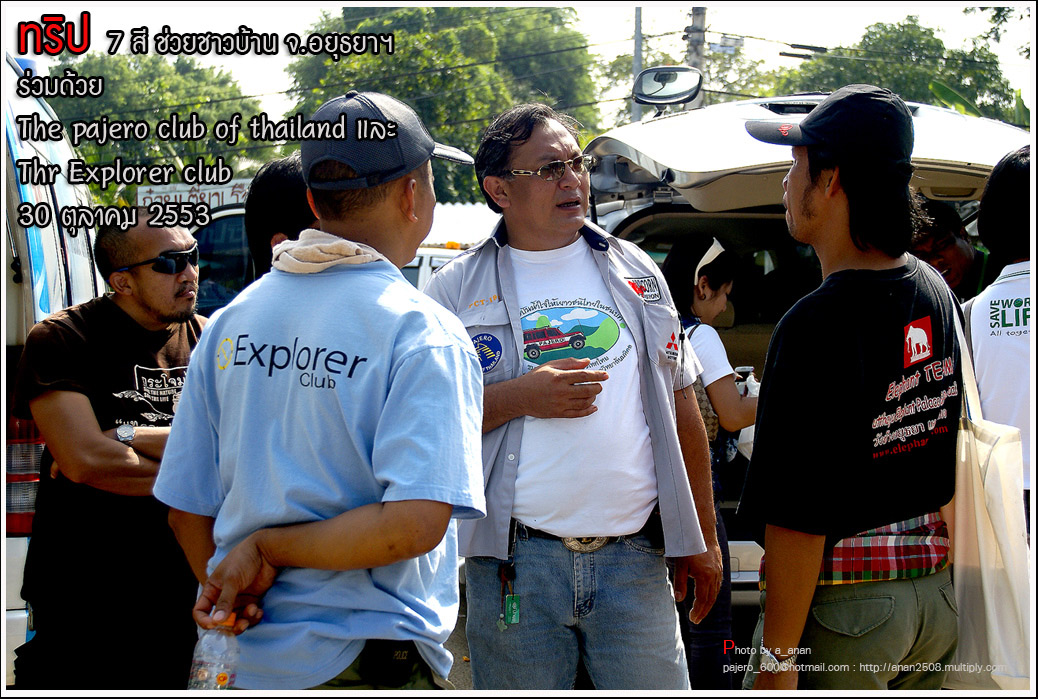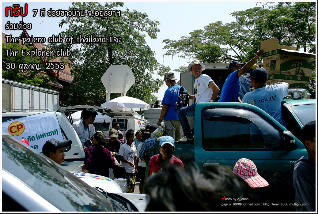 เป็นความร่วมมือของภาคหน่วยงาน ทั้งราชการ เอกชน องค์กรต่างๆ และทางกลุ่ม The pajero club of thailand และThe Explorer club ได้มีโอกาสเดินทางร่วมขบวน เพื่อเข้าช่วยเหลือ แจกจ่ายถุงยังชีพ แก่พี่น้อง ชาวจังหวัด พระนครศรีอยุธยา ด้วยขบวนรถของทางช่องเจ็ด ที่มีสัมภาระจำเป็นแก่ผู้ประสบภัย จำนวน สองคันรถบรรทุก กับขบวนออฟโรด อีกจำนวน 14 คัน เพื่อให้สามารถเข้าถึงพื้นที่ให้ได้มากที่สุด