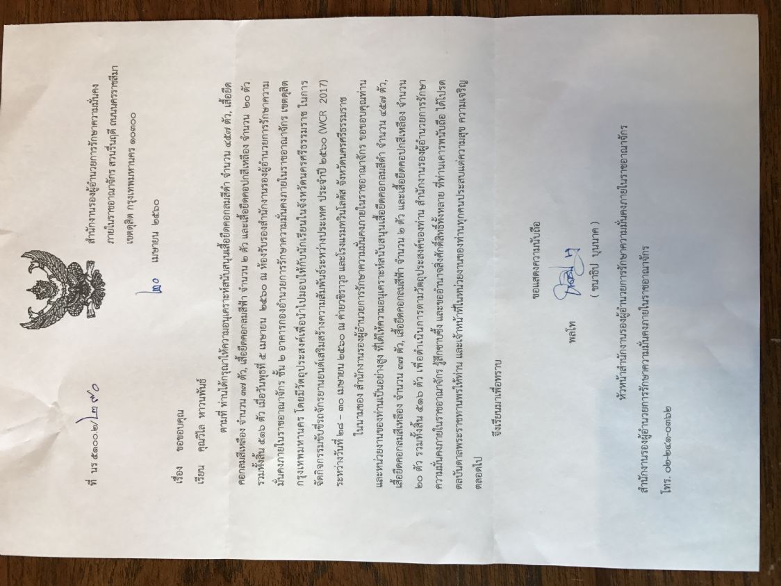 หนังสือขอบคุณ กรณีสนับสนุเสื้อ"ข้าแผ่นดิน จอมสยาม"