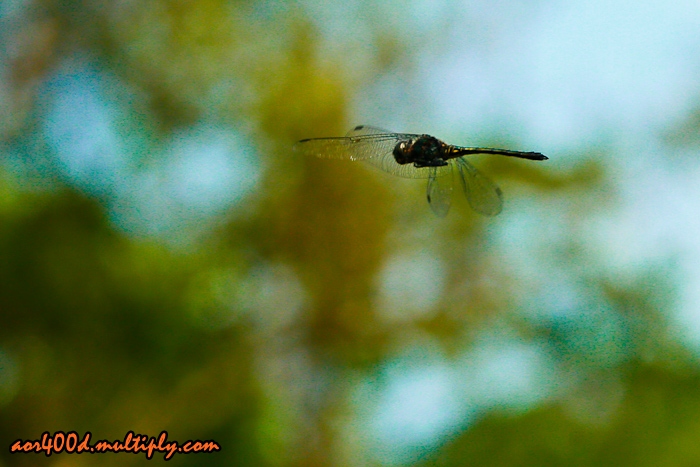 ช่วงที่กำลังนั่งเล็งๆเจ้าแมลงปอน้อยๆอยู่ เจ้าเฮลิคอปเตอร์บินมาทางด้านหลัง เฉี่ยวหัวออไปเลย ตอนแรกตกกะใจนึกว่าผึ้งป่า ตั้งใจไว้แล้วว่าถ้าเป็นผึ้งจะก้มหน้ามุดน้ำแล้วเอามือถือกล้องยกเหนือน้ำไว้ แต่โชคดีที่ไม่ใช่ กว่าจะจับภาพเจ้านี่ได้ก็นานพอสมควร แตจ่เป็นอะไรที่น่ารักมาก ดูเหมือนเขาคงอยากเป็นดารา เพราะบินวนเวียนไปมาอยู่หลายรอบ ทำให้ออได้มีเวลาจับภาพได้ทัน ออพยายามอยู่หลายครั้งมากๆ ตอนแรกใช้โหมดaf ไม่ใช่อคาเดมี่แฟนตาเซียนะคะ แต่มันคือโหมดออโต้โฟกัส ซึ่งมันไม่สามารถจับภาพเจ้าตัวนี้ได้ ออจึงต้องใช้ระบบแมนวลแทน กว่าจะได้ แทบแย่