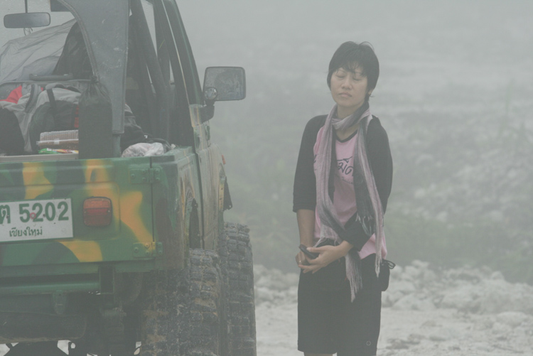 นียืนหนาวเลย .. เราพบกันโดยบังเอิญคะ เพราะนีกับเล็กปั่นจักรยานผ่านหน้าบ้านออบ่อย ออก็มองพวกเขาอยู่เกือบปีได้แล้ว ตอนนั้นออมองแล้วยังอิจฉาอออยากปั่นบ้างแต่ด้วยที่เมื่อก่อนออปั่นจักรยานออกกำลังกายบ่อยๆและมีหมาตัวนึงที่ร้านขายอุปกรณ์ก่อสร้างเขาเพิ่งย้ายมาใหม่ มีหมาสีดำตัวใหญ่มันไม่คุ้นกะจักรยาน มันไล่ออจนออเกือบเสียหลักล้ม ตั้งแต่นั้นมาออเลยเลิกปั่นไปเลย เลิกปั่นเพราะหมาตัวเดียวจริงๆ ....ตอนหลังออมาเปิดร้านกาแฟ นีกับเล็กก็แวะมากินกาแฟที่ร้าน และไปเดินป๊ะกันที่ตลาดบ่อยครั้ง ครั้งล่าสุดไปเจอกัน และนั่นเป็นครั้งแรกที่เราได้คุยกันยาว ออเลยชวนมาเที่ยวภูตาจอซะและก็ได้รู้จักชื่อกันวันนั้นเอง และคาดว่าต่อไปคงได้เที่ยวด้วยกันอีกบ่อยๆนะจ๊ะ เห็นนีสไตล์นี้รู้เลยอารมณ์เดียวกะออแน่ๆ อยากชวนแบกเป้เที่ยวสไตล์สาวๆซะจริงๆเลย