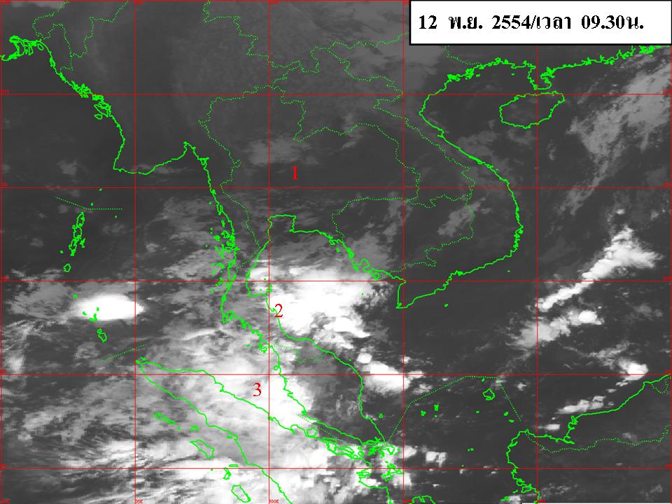 กลุ่มเมฆที่ 2 : กลุ่มเมฆฝนปกคลุมภาคใต้และอ่าวไทย โดยมีฝนและฝนฟ้าคะนองกระจายปกคลุมภาคใต้ฝั่งตะวันออกและภาคใต้ตอนล่าง เนื่องจากอิทธิพลมรสุมตะวันออกเฉียงเหนือที่พัดปกคลุมภาคใต้และอ่าวไทย มีกำลังค่อนข้างแรง ทำให้ภาคใต้ฝั่งตะวันออกมีฝนเพิ่มมากขึ้น