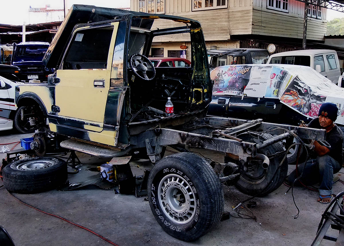 ไม่ได้เอารถเน่าๆมาทำนะ..เอารถปี1996.กระบะพื้นเนียนๆไม่มีผุเลย..รื้อตู้ปลาทิ้งเอาหลังคาตอนเดียวจากร้านซาฟารีมาใส่..เอามาร่นช่วงให้สั้นลง10นิ้ว