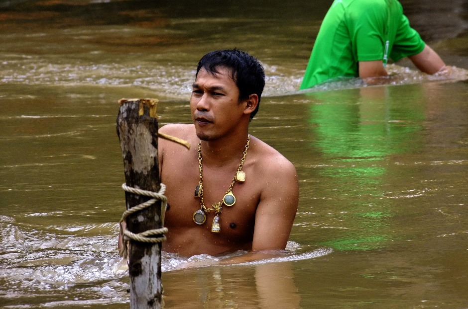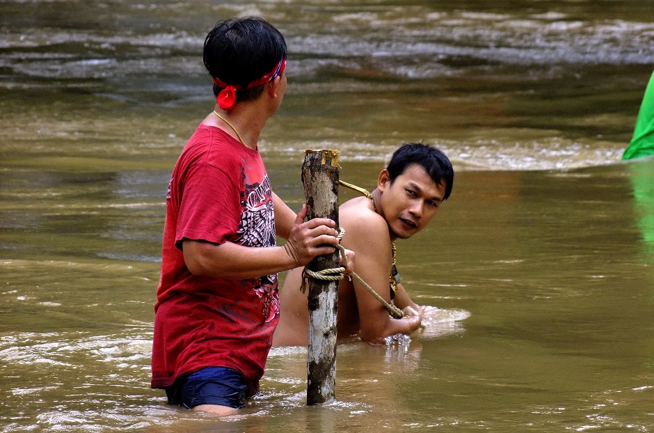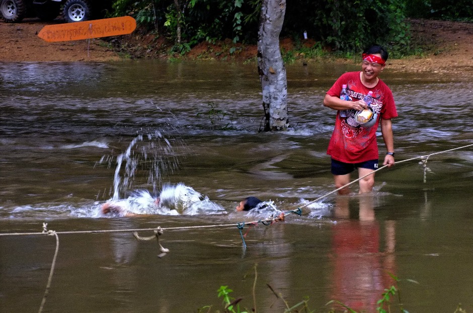 ก่อนอื่นต้องเอาเชือกมาทำเป็นราวเกาะไว้เวลาเดินลุยกระแสน้ำออกไป