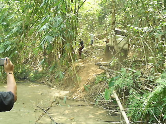 ตะพักตัวนี้ความชันค่อนข้างมากทีเดียว เรียกว่า ตลิ่งก็ได้ครับ เป็นตลิ่งชันเลยล่ะครับ ก่อนขึ้นกันชนหน้าก็ชนดินเต็มๆเลยครับ แต่ก็ขวิดดันไปเลย และกดคันเร่งเข้าไปแบบเต็มๆ ซึ่งสิ่งที่สังเกตได้อย่างชัดเจนก็คือ ตำแหน่งของล้อหน้าที่ได้มีการพาดยาวไปที่ด้านบนของเนินค่อนข้างมาก ซึ่งก็จะมากกว่าคันสีเหลืองก่อนหน้านี้อยู่พอสมควร ทำให้มีระยะที่จะพยายามจูงล้อหลังให้ขึ้นตามไปด้วยตามแรงเครื่องที่ส่งออกมา อีกทั้งล้อหลังก็ได้ระยะเทคก่อนที่จะมาถึงตีนเนินอยู่พอสมควรอีกด้วย ดังนั้นพอมากระแทกเนินก็จะมีแรงส่งที่มากกว่าพวกรถที่เป็นแบบช่วงสั้น ที่เหลือคือความแรงของเครื่องกับระบบดิฟล็อคหน้าหลังที่งัดเอามาใช้แบบเต็มรูปแบบ