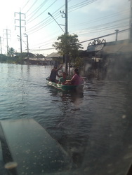 ภาพนี้บนถนนกาญจณาภิเษก ชาวบ้านต้องใช้เรือในการเดินทาง