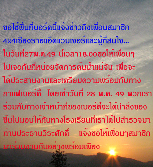 โอกาสนี้ผมเองก็ถือโอกาสนำรูปของสมาชิกบางส่วนมาเปิดตัวให้ผู้นิยมออฟโรดได้รู้จัก หากมีโอกาสขึ้นมาท่องเที่ยวจังหวัดเชียงรายต้องการข้อมูลหรือความช่วยเหลือสามารถประสานกับทางชมรม4x4เชียงรายแอ็ดแวนเจอร์ได้