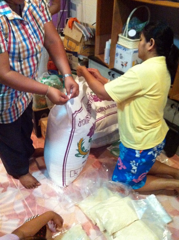 แม่บ้านพร้อมสมาชิกช่วยกันแยกข้าวสารเป็นชุดๆ เพื่อสดวกในการนำไปมอบให้กับผู้ประสบภัย