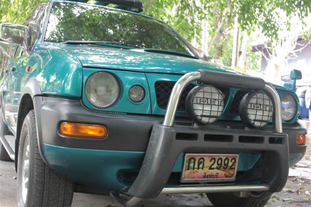 ก่อนตัดต้องมีประแจดาว แบบมีเดือยตรงกลาง เพราะว่าต้องเอาพลาสติกสีดำที่ครอบแสตนเลสออกก่อน ถึงจะตัดหูยึดออกได้ มิฉะนั้นเอาแก๊สเป่าไป พลาสติกจะเสียรูปและไม่สวยครับ ส่วนรูสำหรับยึดน๊อต 4 ตัวเพื่อยึดกันชนหน้านั้น ด้านซ้ายก็คือที่เดียวกับที่ยึดหูสำหรับลากรถครับ ถอดน๊อตไปเทียบร้านแล้วซื้อเพิ่มอีก 2 ตัว ก็จบแล้ว ผมไม่มีประแจดาว ไปขอยืมหาเอาตามร้านซ่อมรถครับ แต่ตอนนี้ผมซื้อเก็บไว้ 1 ชุดครับ เอาไว้ยืมใช้กันได้เลย (170 บาทเอง)
