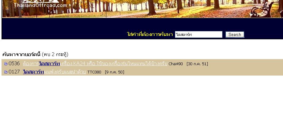 ผมลองก๊อปคำว่า ไดสตาร์ทผมพังครับแนะนำด้วย ไปที่ด้านบนขวามือของเวป จะมีช่องค้นหาแล้วนำที่ก๊อปมาวาง ลง แล้วก็กดค้นหาก็ใช้งานได้แล้วครับ