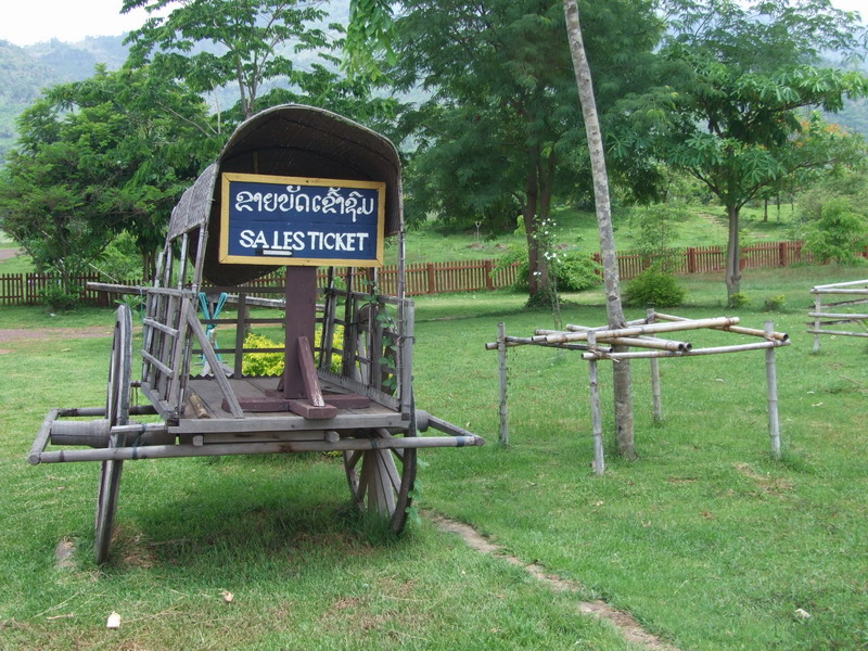 ป้ายสีน้ำเงินแขวนไว้ที่เกวียน อ่านว่า " ขายบัตรเข้าชม"