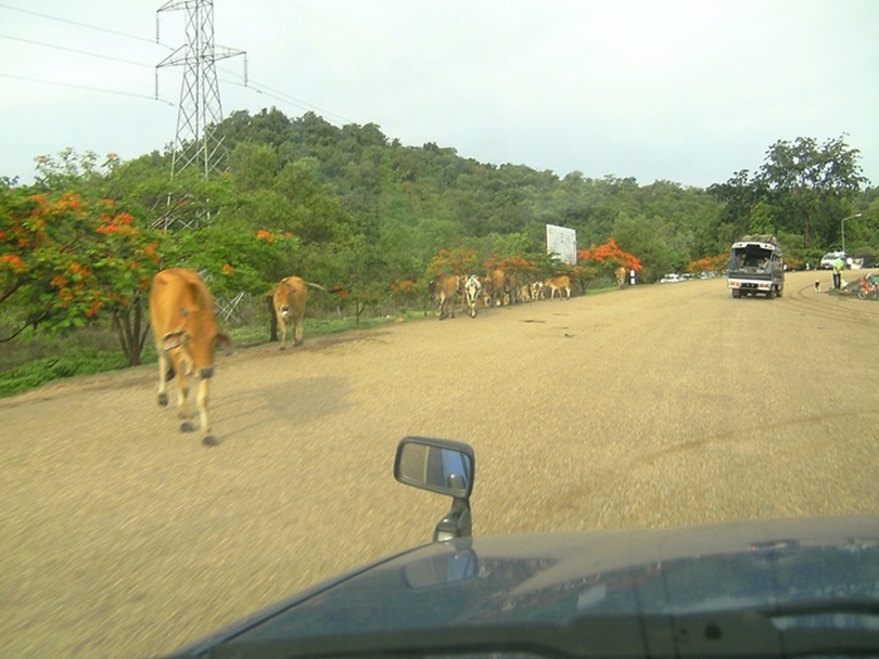 ขับรถในลาวต้องชิดขวา มีผู้ร่วมใช้ถนนเยอะ มีว้ว ควาย หมูหมาไก่ แพะแล้วก็นี่ จยย อันตรายมากโดยเฉพาะนักศึกษาขาวๆนั่งฃ้อนท้าย ที่ทำให้ คนขับสติแตกไปเลย