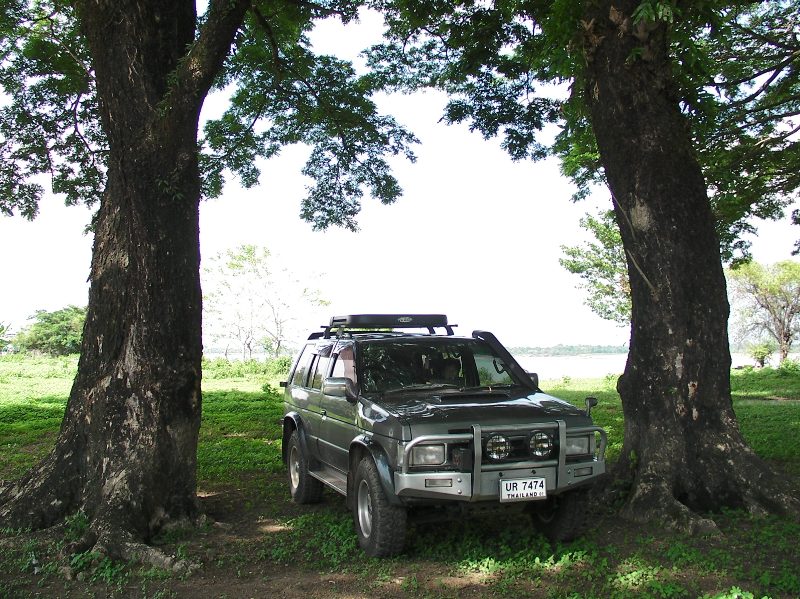 ชักรูป เทอ 1 คู่กับลำน้ำโขงด้านหลัง กลางวันอากาศร้อน ต้องบังเงาต้นไม้สองต้น