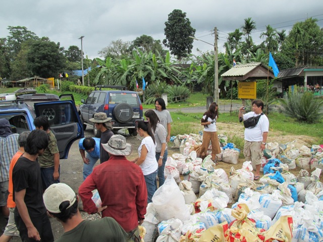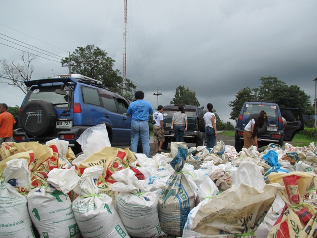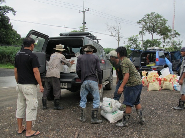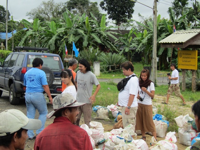ผมติดพาลูกไปเรียนติวกลับมาทางหมู่บ้านช่วยกันนำกระสอบทรายอุดรูตามกำแพงน้ำจึงลดยาวเกือบ1กิโล