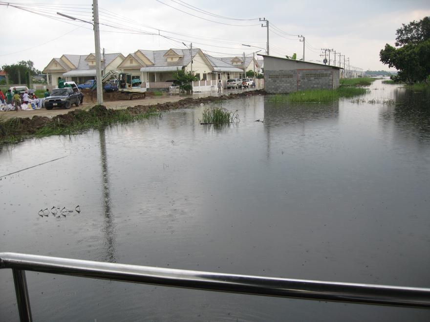 น้ำในหมู่บ้านแห้งแต่รอบๆสูง 50 ซม. แต่ถ้าน้ำที่กำลังมาคงเพิ่มอีก 50 ก็ประมาณ 1 เมตร แนวกระสอบสูง 60