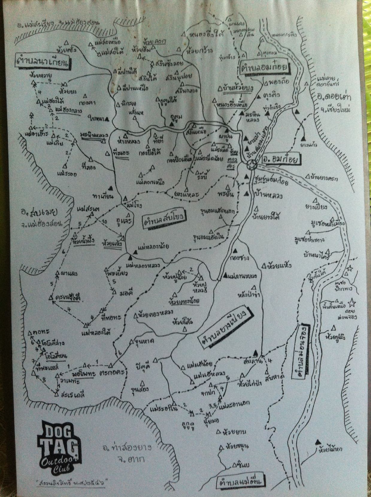 ผมมีแผนที่ "อมก๋อย" ซึ่งผมสเก็ตเอามาจากแผ่นแผนที่ที่คุณครูกศน. เอามาอธิบายให้ทราบถึงหมู่บ้านต่างๆในทริปร่วมใจสู่แดนไกล บ้านห้วยครั่ง ตำบลนาเกียน ของ Dogtag Outdoor Club เมื่อปี 46 โน้นนะครับ..