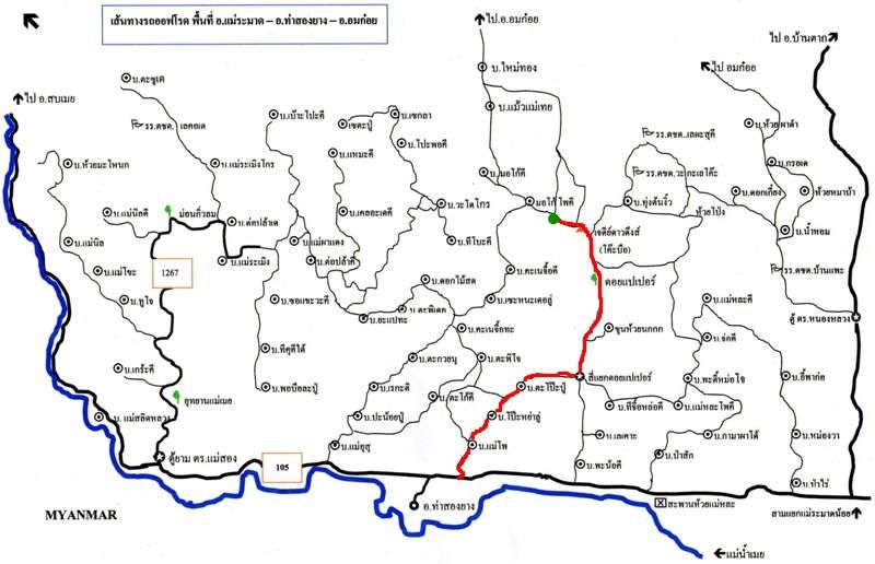 เส้นทางที่ไป....คือเส้นสีแดงครับ จากท่าสองยางเข้าทาง บ.แม่โพ ระยะทางประมาณ 25 กม. ใช้เวลา 2 ชั่วโมงกว่าๆ