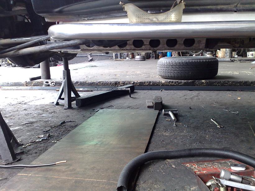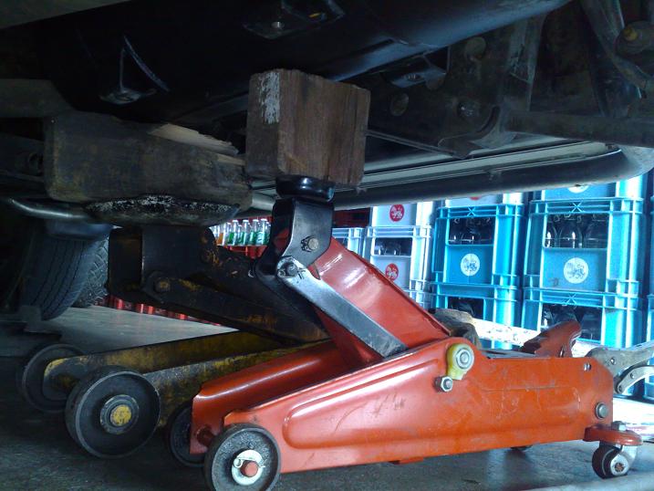 แล้วเอาแม่แรงดันขึ้นเบาๆ ดันพื้นรถให้โก่งขึ้นไปเลย
