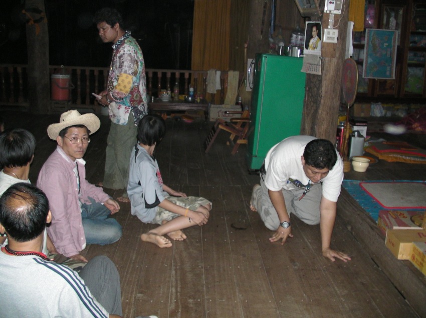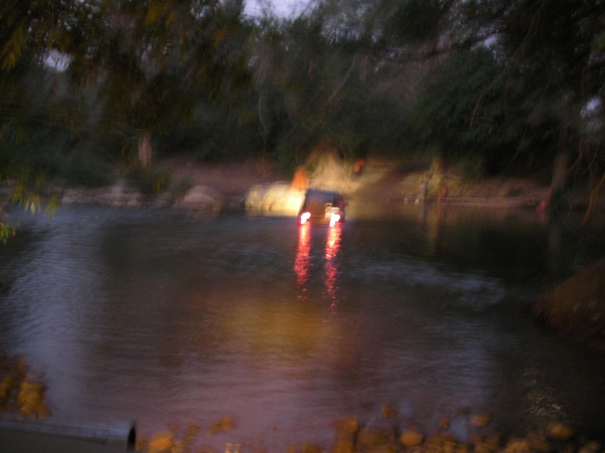 ข้ามมาแล้วก็ไปอีกแม่น้ำ มีหินใหญ่อยู่กลางน้ำกลางความมืด และบนก้อนหินมีหลวงพี่ยืนอยู่ มือฃ้ายถ์อไฟฉายโบกไปมา มือขวาถือวอแดงจ่อปาก ใด้ยินเสียงหลวงพี่ผ่านวิทยุว่า "ขับมาตรงๆ มาที่พระยืนอยู่ ให้ขับชิดก้อนหินแล้วหักขวาตรงเข้าช่องไปเลยเวลานั้นผมว่าน้ำถึงประตูรถแล้ว แต่ไม่สนใจ ตรงช่องทางขึ้น ก็ยังมีพระยืนโบกไฟฉายอีกองค์ อะไรจะขนาดนั้น มากับพระจริงๆๆ