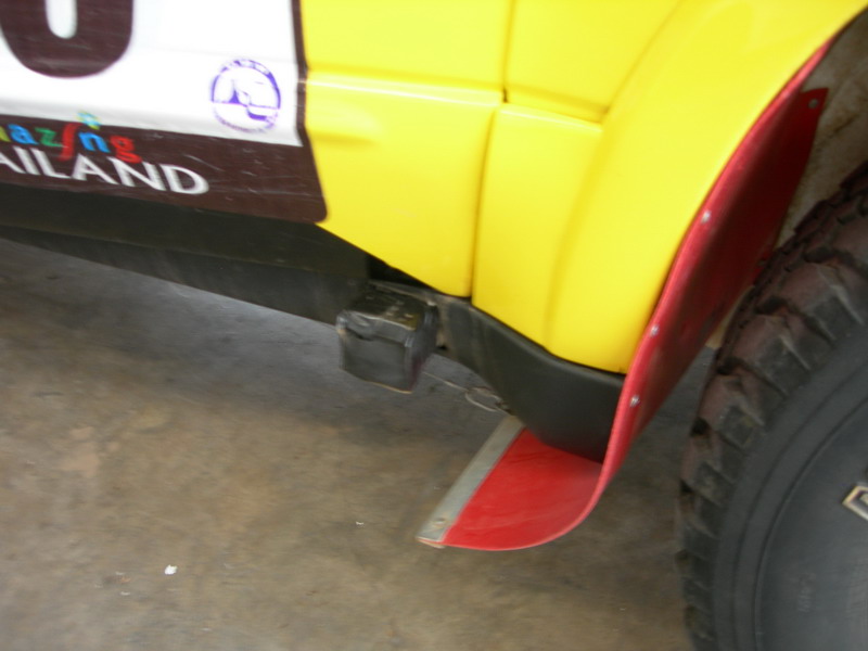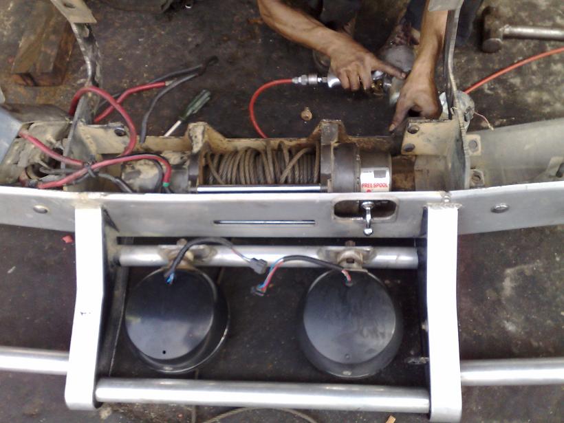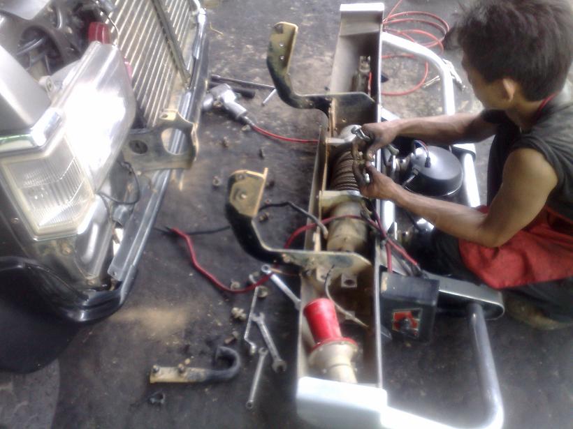 ช่างกำลังยึดขาวิ้นส์กับกันชน ด้วยน๊อท 12 มม ข้างละ 2 ตัว และด้านหน้า ยึดอีก2ตัว (2ตัวนี้จะร้อยยึด3ชิ้นคือ ขาวิ้นส์ กันชนและโลเล่อครับ) กันชนต้องมีช่อง3ช่อง คือช่องคันเกียร์ ช่องมองดูสลิง และช่องโลเล่อคร้บ