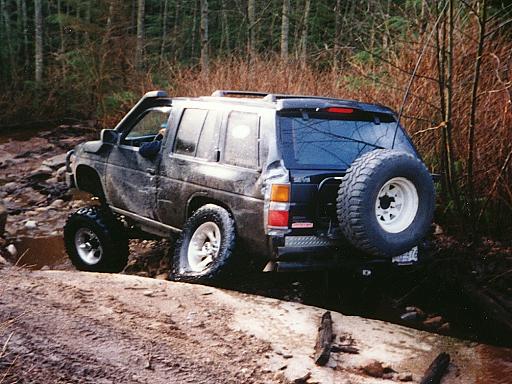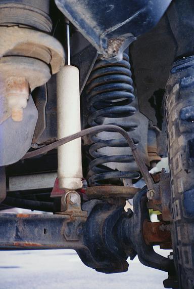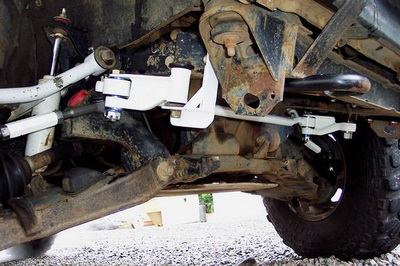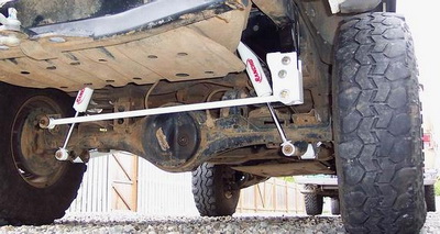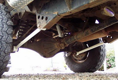 The Bronco radius arms required custom crossmembers and brackets to mount them because the Nissan frame is wider than the original Bronco frame at that point. These crossmembers span the space between the existing frame crossmembers. In order to locate the axle properly with the coil springs, a panhard rod (track bar) was added as well.