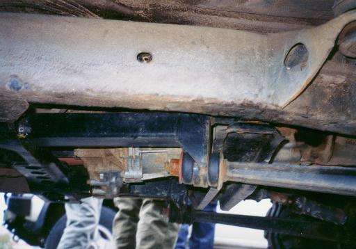 Because of the positioning of the D44, the oil pan had to be modified slightly to clear the pumpkin. This was done by slicing the sump horizontally and shifting it to the right. The exhaust had to be modified slightly to clear the driveshaft, and the crossmember was slightly notched to increase the driveshaft clearance.