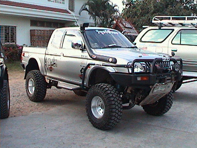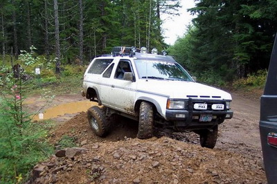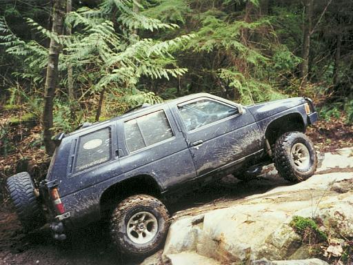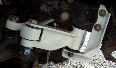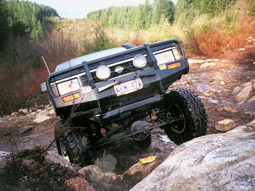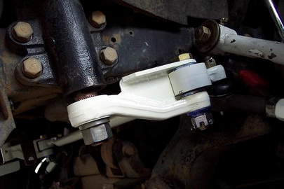 A standard crossover steering setup is used, along with the stock Nissan power steering box and pitman arm. Repositioning of the steering box on the frame by several inches was necessary to align it with the rest of the steering mechanism. Finally, a Rancho RS5000 steering stabilizer was added to complete the system.