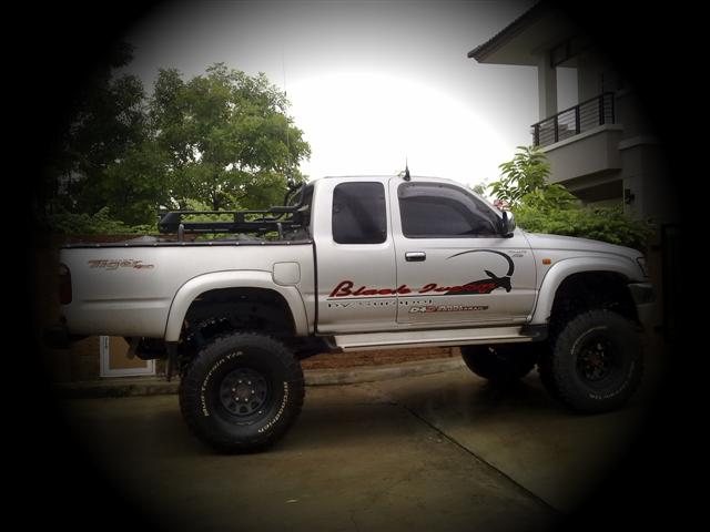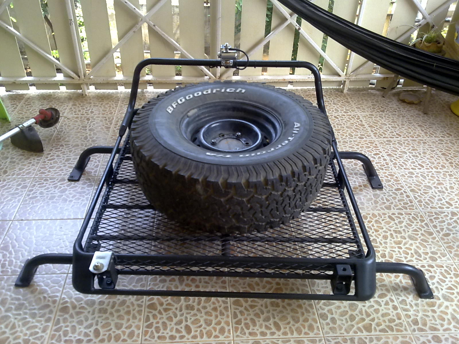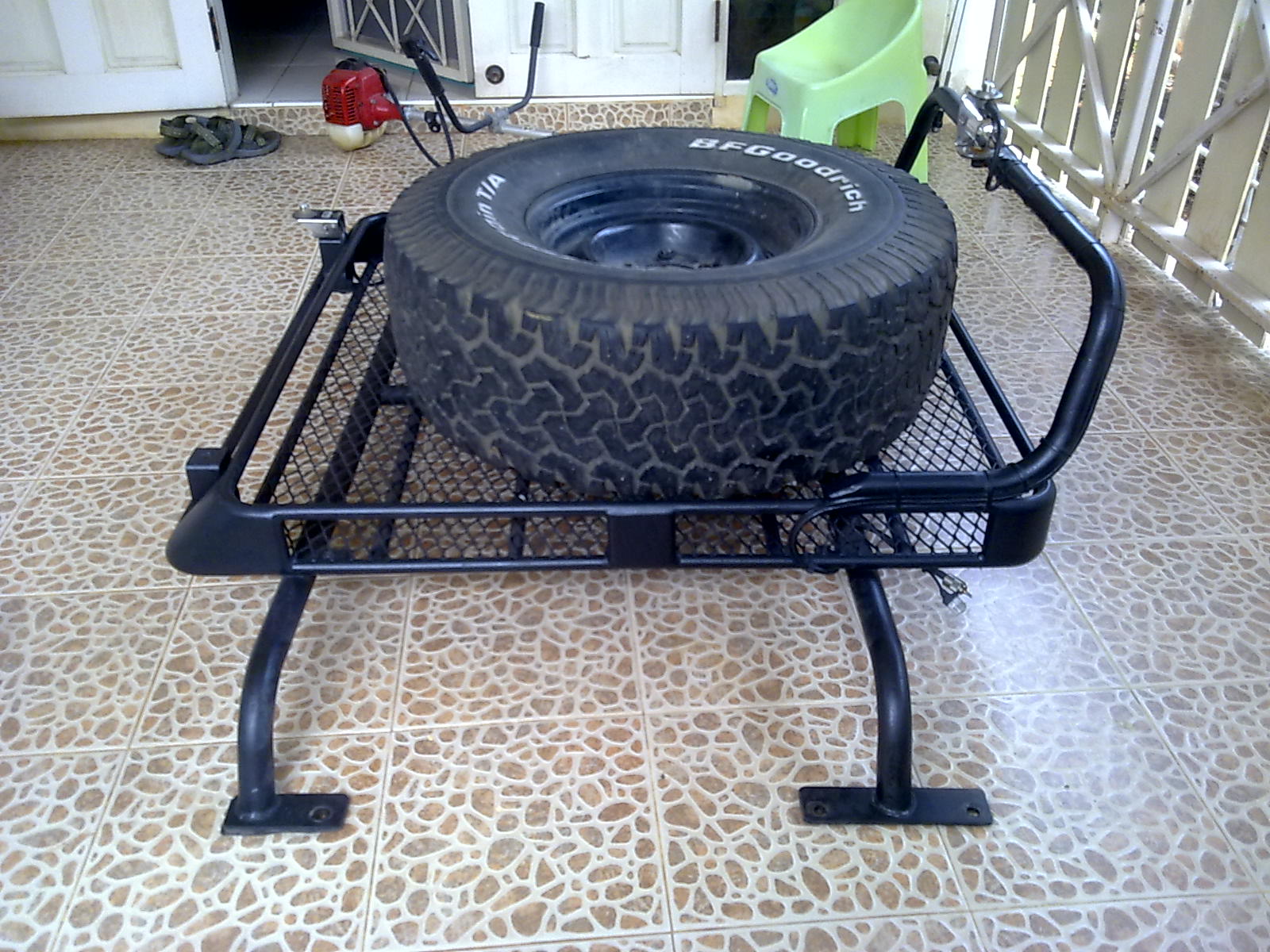 มี Rack พร้อมตะแกรงสำหรับวางยางอะไหล่ขนาด 33 นิ้วพร้อมฐานล๊อคหรือใส่สัมภาระก็ได้ ออกแบบไว้สำหรับวางบนขอบกะบะ ( ถอดออกเพราะเอารถไปทำสีทั้งคันมา และจะหา Carry boy มาใส่แทนครับ )