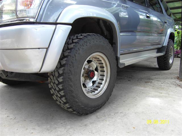 เจ้านี้น่ะ เขาทำใหญ่กว่าเจ้าอื่นในเบอร์เดียวกันประมาณหนึ่งเบอร์ อันนี้ ขอยกตัวอย่างขอบ 16 มาเทียบให้ฟังนะครับ เช่น ผมใช้ขนาด 245/75/16 ถ้าเทียบกับเจ้าอื่นมันจะได้เกือบเท่ากับ 265/75/16 ของเจ้าอื่นเลยทีเดียว แต่โดยรวมแล้วมันเท่ากับยาง 31 นิ้วขอบ 15 ของเจ้าอื่นแล้วแหละครับ