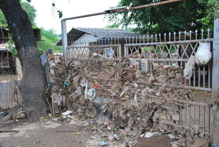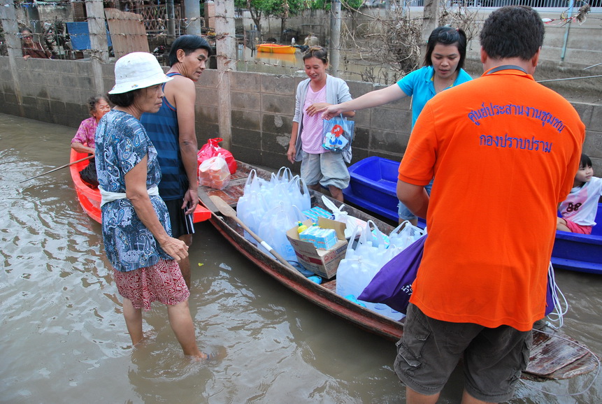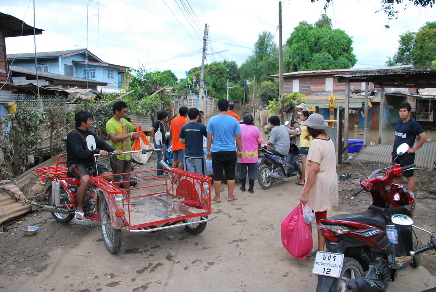 ชาวบ้านออกมารับของกันแล้ว โปรดสังเกตว่าระดับน้ำที่ด้านในของหมู่บ้านยังสูงมิดหัวอยู่ครับ ต้องเดินไต่กำแพงกันมา....