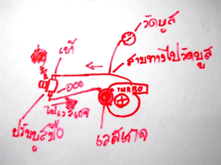 ลองต่อดูครับ ต่อท่อลมออกจากตัวเทอร์โบครับ ยิงตรงไปที่ปรับบูสมือครับทางเข้าครับ แล้วตัดสามทางต่อท่อไปวัดบูสระหว่างเทอร์โบกับปรับบูสมือครับ