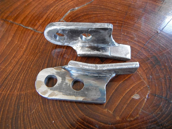 ใช้เหล็กแผ่นพับขอบรับขาเดิม(ที่ต้องพับขอบเพราะเวลาใช้งานขอบนี้มันจะกะไว้ไม่ให้หมุนได้) เจาะรูร้อยน๊อตกับขาเดิม ตรงปลายเจาะรูรับสายเบรค
