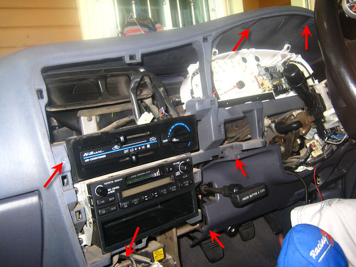 การตั้งเข็มไมล์ เริ่มจากถอดแผงคอลโซลออกมา มีจุดยึดสกรูคร่าวๆ ตามที่ลูกศรชี้
