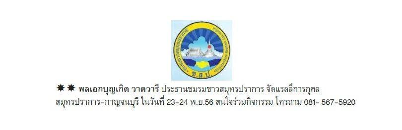 พลเอกบุญเกิด วาดวารี ประธานชมรมชาวสมุทรปราการ จัดแรลลี่การกุศลสมุทรปราการ-กาญจนบุรี ในวันที่ 23-24 พ.ย.56 สนใจร่วมกิจกรรม โทรถาม 081-567-5920