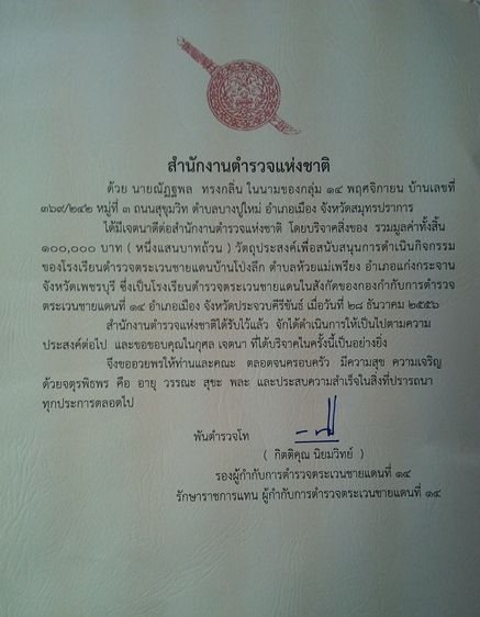 หนังสือขอบคุณจาก สำนักงานตำรวจแห่งชาติ