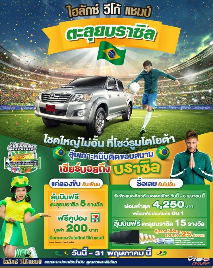 สำหรับคอรักวีโก้ทั้งหลายห้ามพลาดกับแคมเปญสุดพิเศษ ไฮลักซ์ วีโก้ แชมป์ ตะลุยบราซิลเพียงแค่ทดลองขับไฮลักซ์ วีโก้ แชมป์ รุ่นใดก็ได้ ที่โชว์รูมโตโยต้าทุกสาขา จะได้รับบัตรของขวัญ 7-Eleven มูลค่า 200 บาท และคูปองส่งชิงโชคลุ้นรับสิทธิ์แพคเกจทัวร์ ชมการแข่งขันฟุตบอลระดับโลก ที่ประเทศบราซิล 8 วัน 7 คืน มูลค่ารางวัลละ 850,000 บาททันที แจกทั้งหมด 5 รางวัล (รางวัลละ 1 ที่นั่ง)