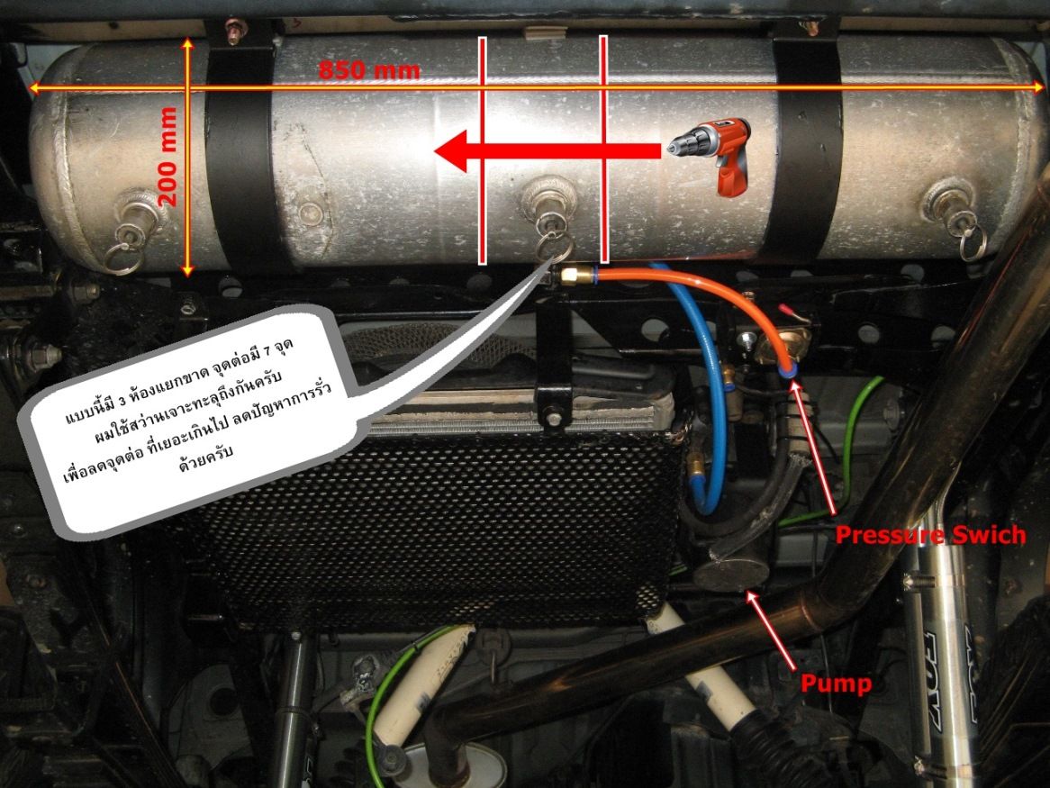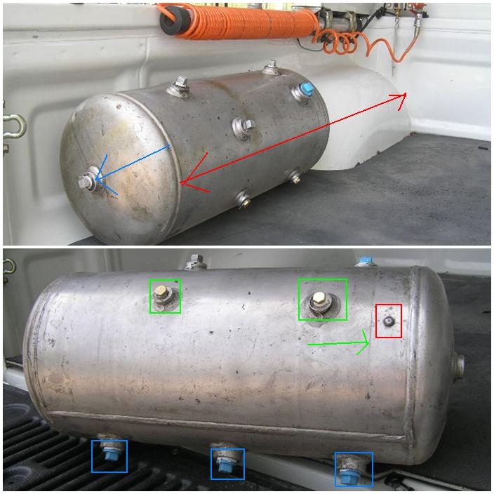 -ถังตัวใหม่ที่ได้มา แบ่งเป็น 3 ตอนแยกจากกันเช่นกัน รูที่ด้านหน้าตัดมีด้านเดียว ขนาด 3 หุน ผมก็คิดจะทะลวงเหมือนกัน แต่ไม่รู้จะทำได้อย่างไร อยากแบ่งเป็นลม 2 ส่วน น้ำ 1 ส่วน หรือกลับกัน เพราะรู(ถ่ายน้ำ) ก้นถัง มี 2 แห่ง (ตำแหน่งไม่เป็นระเบียบ จึงเดาว่าเป็น(ก้น)ถัง จากรอยเหล็กรัดถัง เป็นจุดถ่ายน้ำทิ้ง) หมายถึงคิดเรื่องปั๊มน้ำเข้ามาด้วย เพราะมีลมอยู่อีกถังอยู่แล้วครับ...