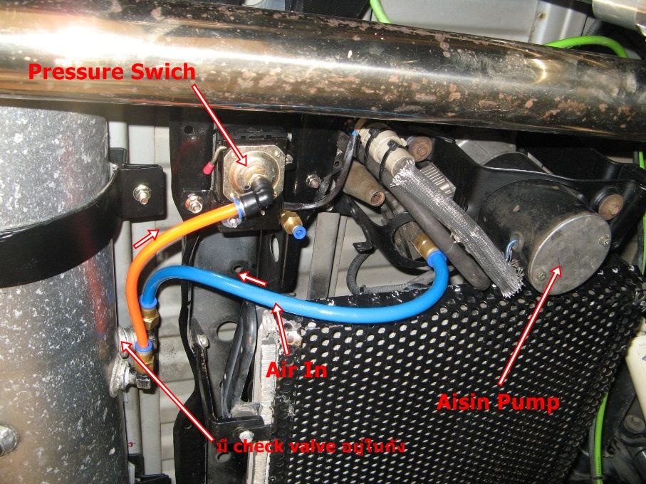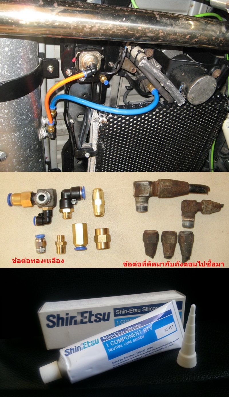 -กรอบสีแดงคือเช็ควาวล์ทองเหลืองขนาด(จำไม่ได้แล้ว)กรอบสีเขียวคือรูลมส่งแรงดันกลับไปที่ pressure switch ผมไม่ได้ต่อจึงอุดด้วยน็อตทองเหลือง...ศรสีเขียวชี้เกลียวนอกของเช็ควาวล์ หาเกลียวมาต่อไม่ได้ จึงนำไปจ้างโรงกลึงทำเกลียวใน รุ่นอื่นที่เนื้อทองเหลืองส่วนนี้บาง ก็ทำไม่ได้เช่นกันครับ...