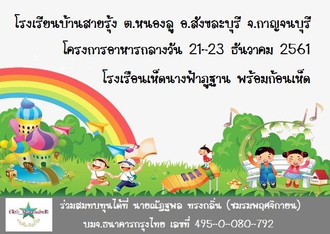 เรียนเชิญร่วมเป็นเจ้าภาพสร้างโรงเรือนเห็ดเพื่อเป็นทุนอาหารกลางวันเด็กนักเรียน รร.บ้านสายรุ้ง ตำบลหนองลู อำเภอสังขละบุรี จังหวัดกาญจนบุรี และมอบอุปกรณ์กีฬา เลี้ยงอาหารกลางวัน
