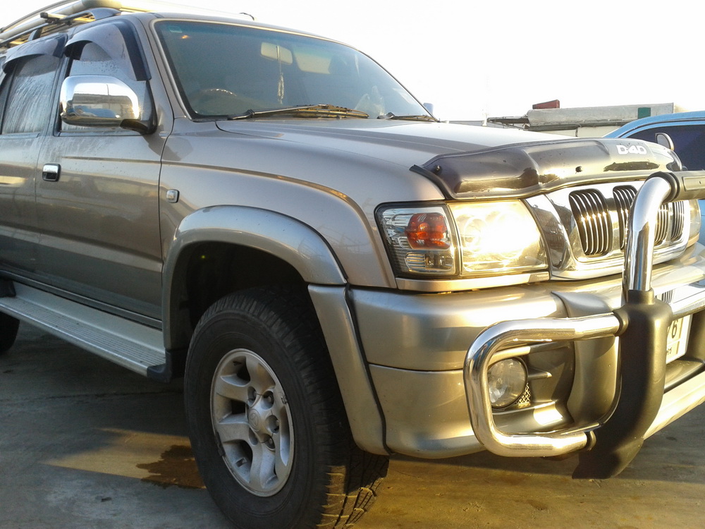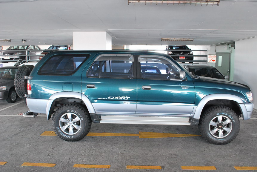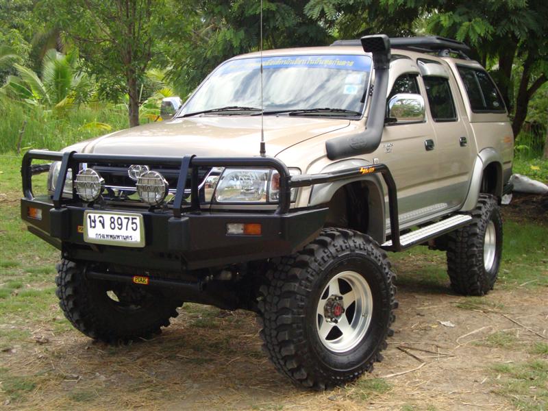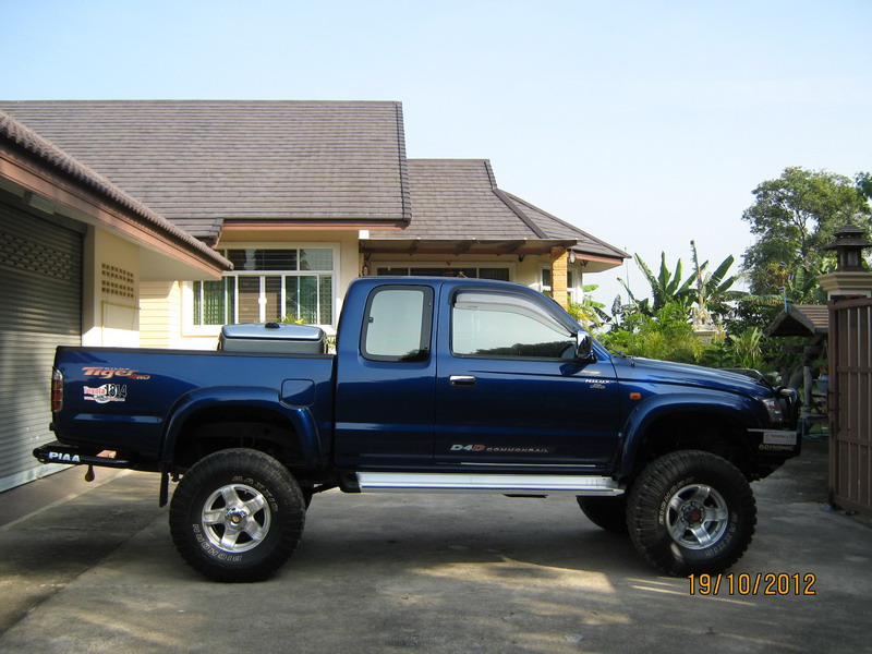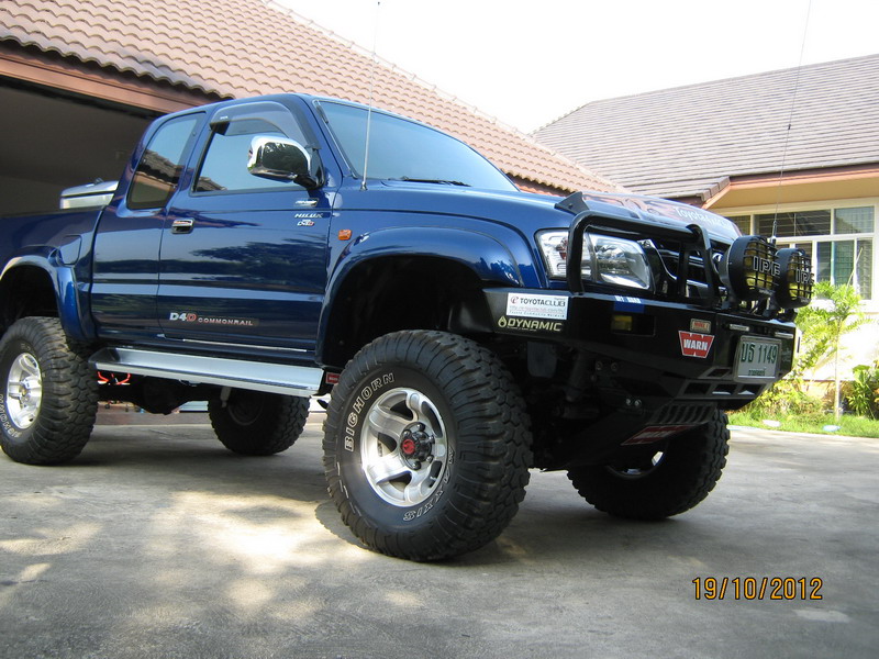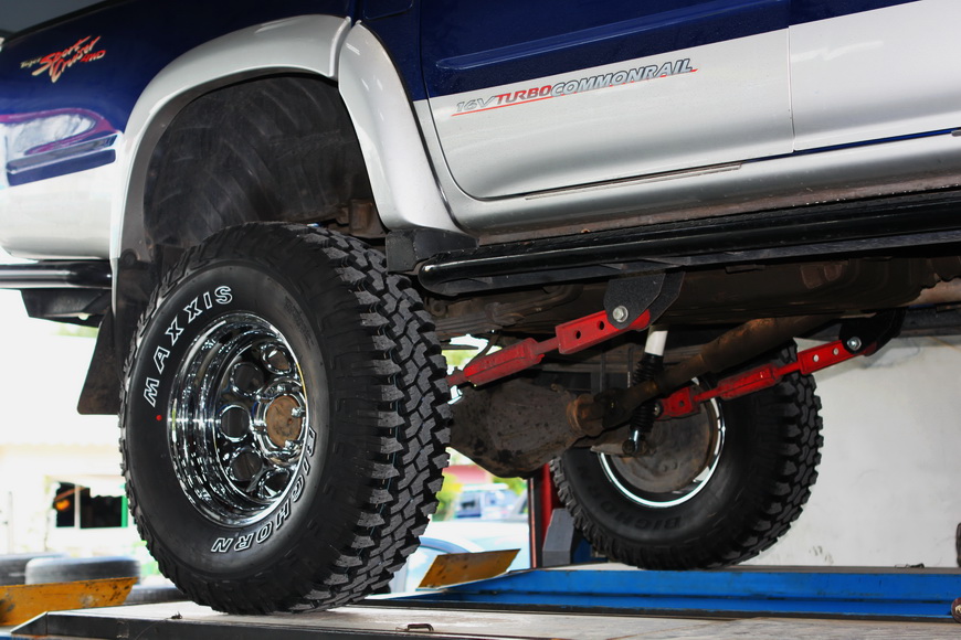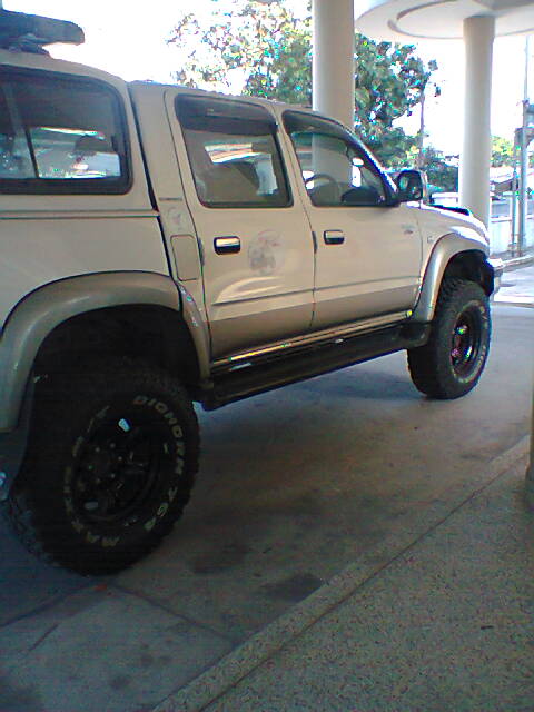ไม่นานหลังจากเทรนนิ่งก็ลองเอายาง MT มาใส่ดู....ล้อแม็ก Vigo ขอบสิบหก เดิมๆครับ.....ตอนนั้นแค่ใส่แหนบ ขันทอร์ชั่นบาร์หน้าขึ้นนิดเดียว (ยังใช้ทอร์ชั่นบาร์เดิมๆ รองก้อนปีกนกหน้าก็ยังไม่มี) ข้างหน้าแข็งกระด้างขึ้นกว่าล้อเดิมหน่อยๆ คงเป็นเพราะเนื้อยางน้อยลงด้วยส่วนหนึ่ง แต่ข้างหลังใส่แหนบเสริม นิ่มลงเห็นๆจนต้องไปปรับระดับความแข็งของโช๊คขึ้นเบอร์หนึ่ง (รันโช่ อาร์เอ็กซ์เก้าพัน ปรับได้ห้าระดับทั้งสี่ต้นครับ) ตอนใส่กับแม็กตัวนี้คือเลี้ยวยุบตัวยังไงก็ไม่ติด ไม่เฉี่ยวเลยครับ แต่ดูไม่สวยเพราะออฟเซ็ตมันหุบเข้าไปจากเดิมเยอะ (เดิมๆ +8 ของวีโก้น่าจะ +30 ไม่เกินนี้)
